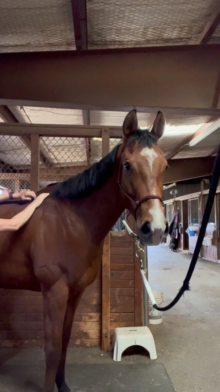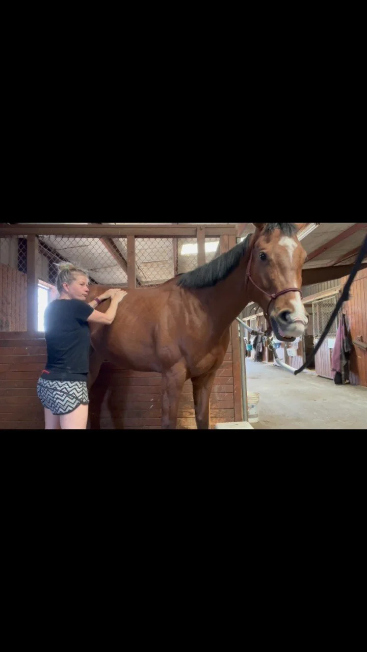 “Mom got her equine massage certification for me, and it’s great! I like to lean into the pressure when she’s near where my splenius and brachiocephalic meet near my poll. I also love having my hind end worked on. I would recommend her to all my barn mates!“